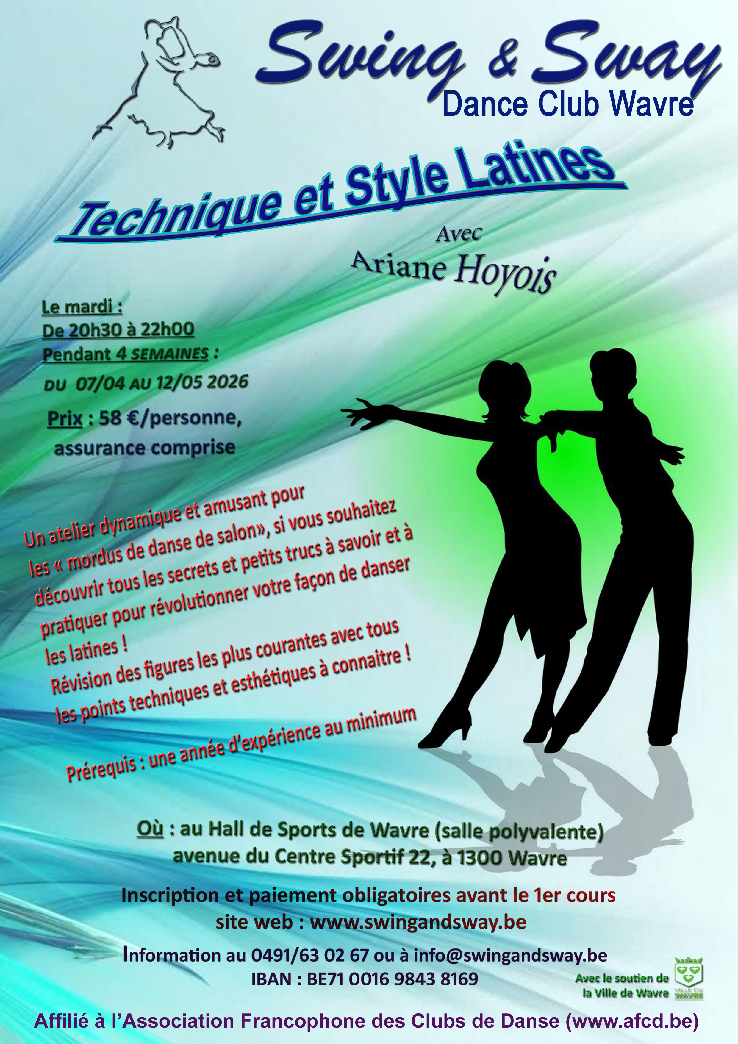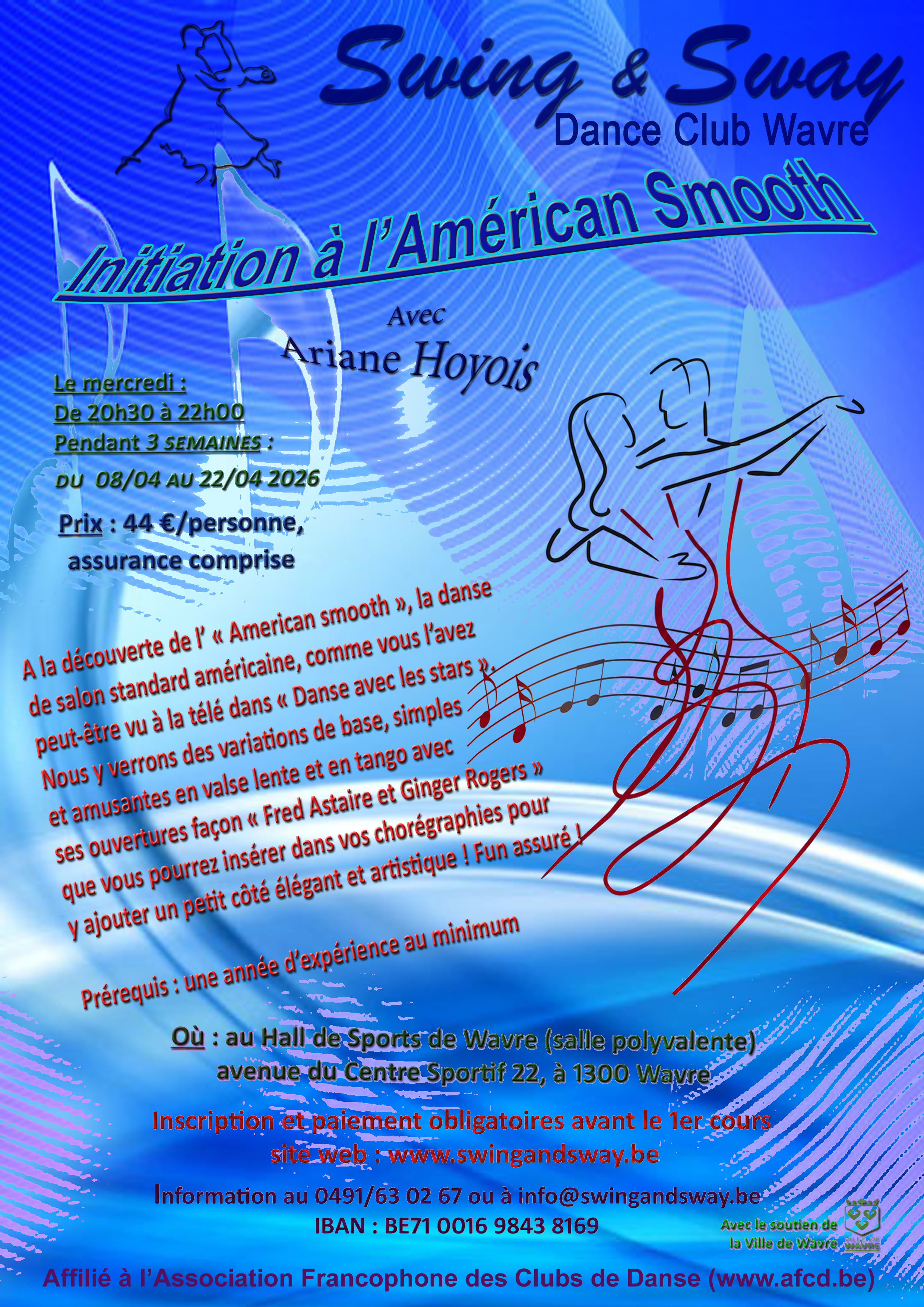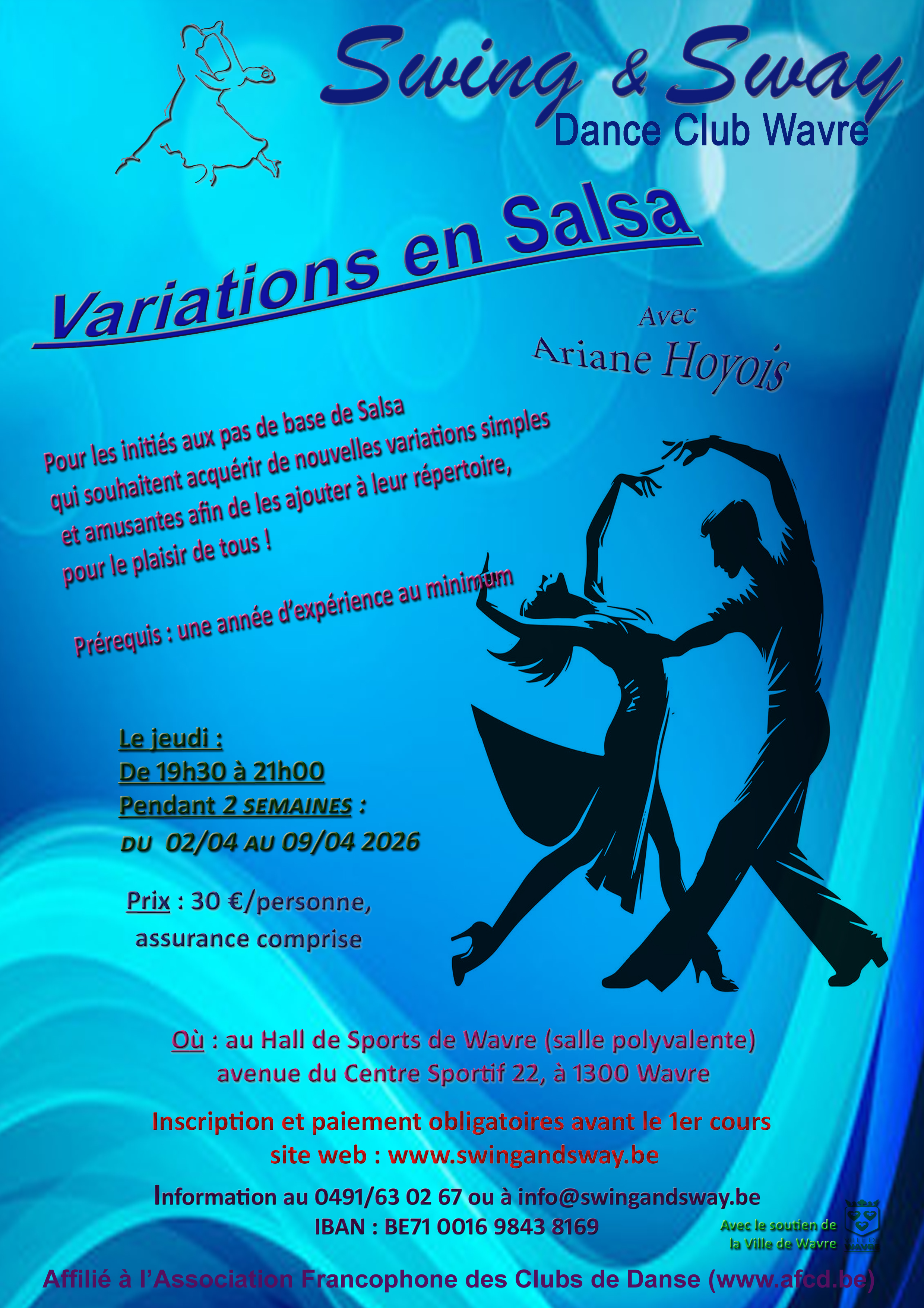 Cotisation : 58€ par personne payable de préférence sur le compte BE71 0016 9843 8169 de Swing & Sway.