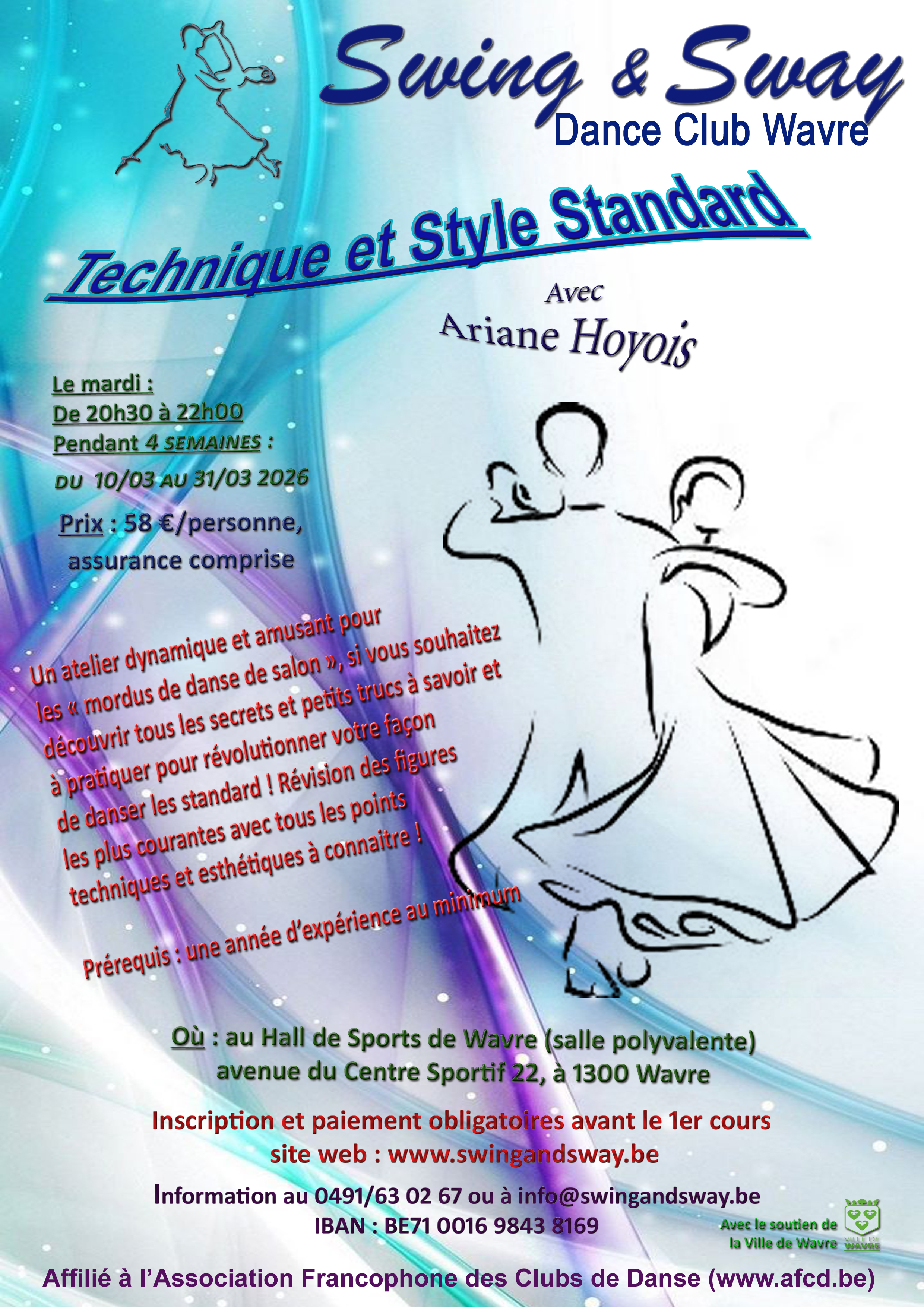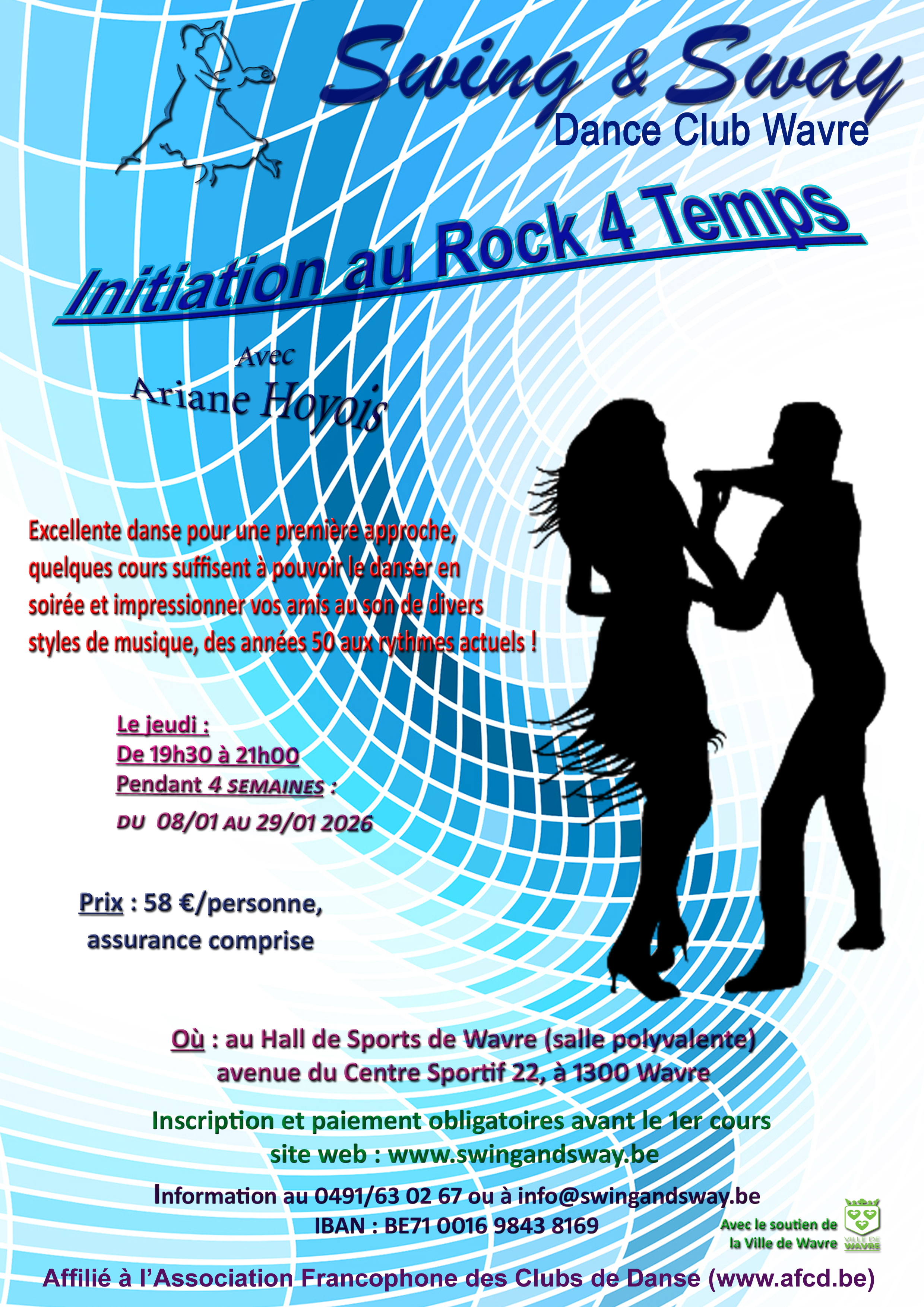 Cotisation : 58€ par personne payable de préférence sur le compte BE71 0016 9843 8169 de Swing & Sway.