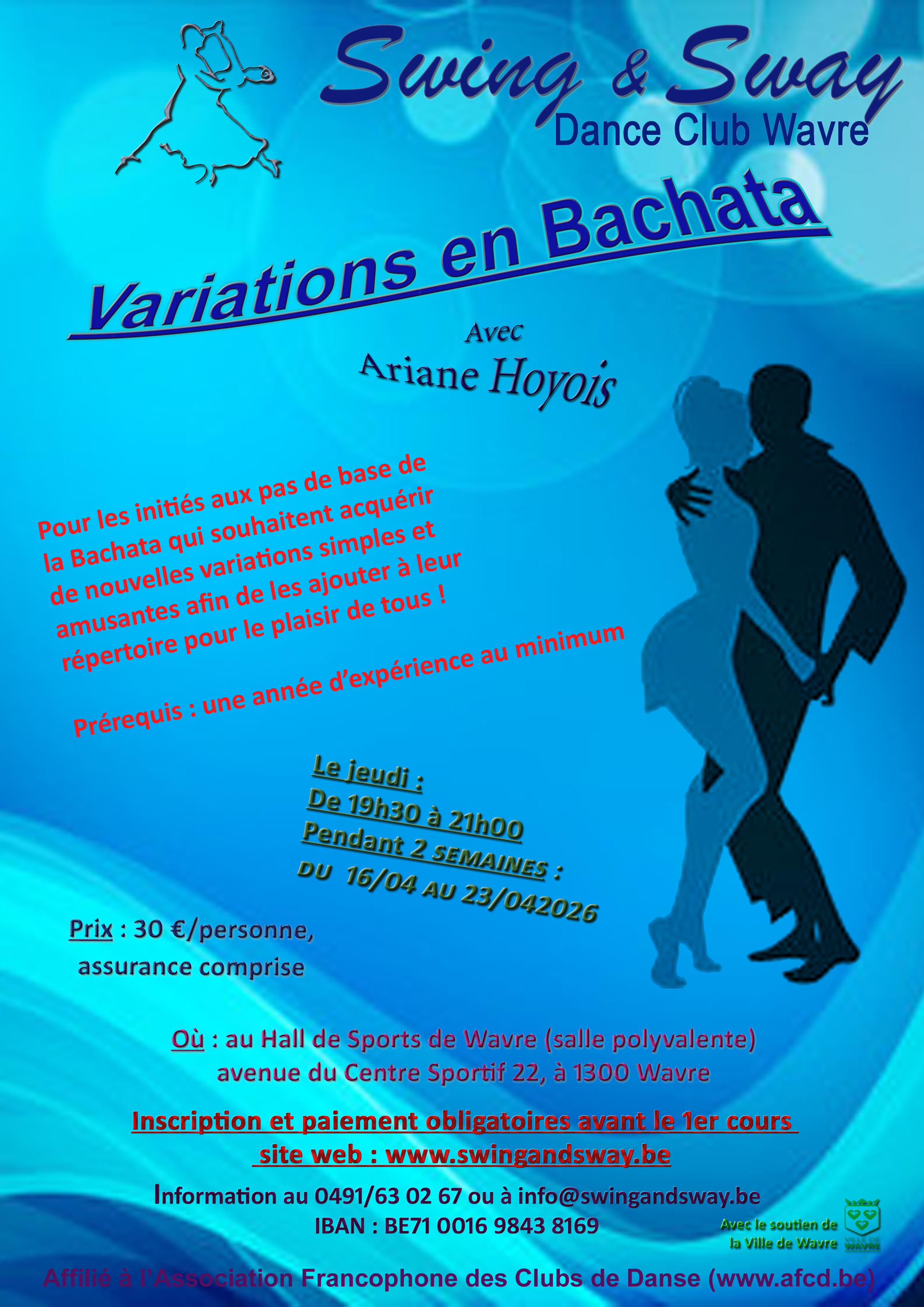 Cotisation : 44€ par personne ou 30.5€ si vous avez suivi un cours de 24 heures payable de préférence sur le compte BE71 0016 9843 8169 de Swing & Sway.